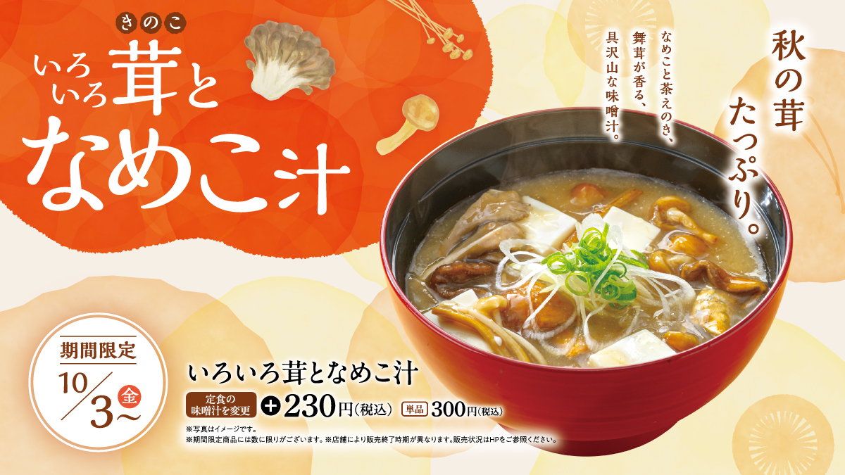 10月3日(金)より、秋季限定「いろいろ茸となめこ汁」を販売いたします。