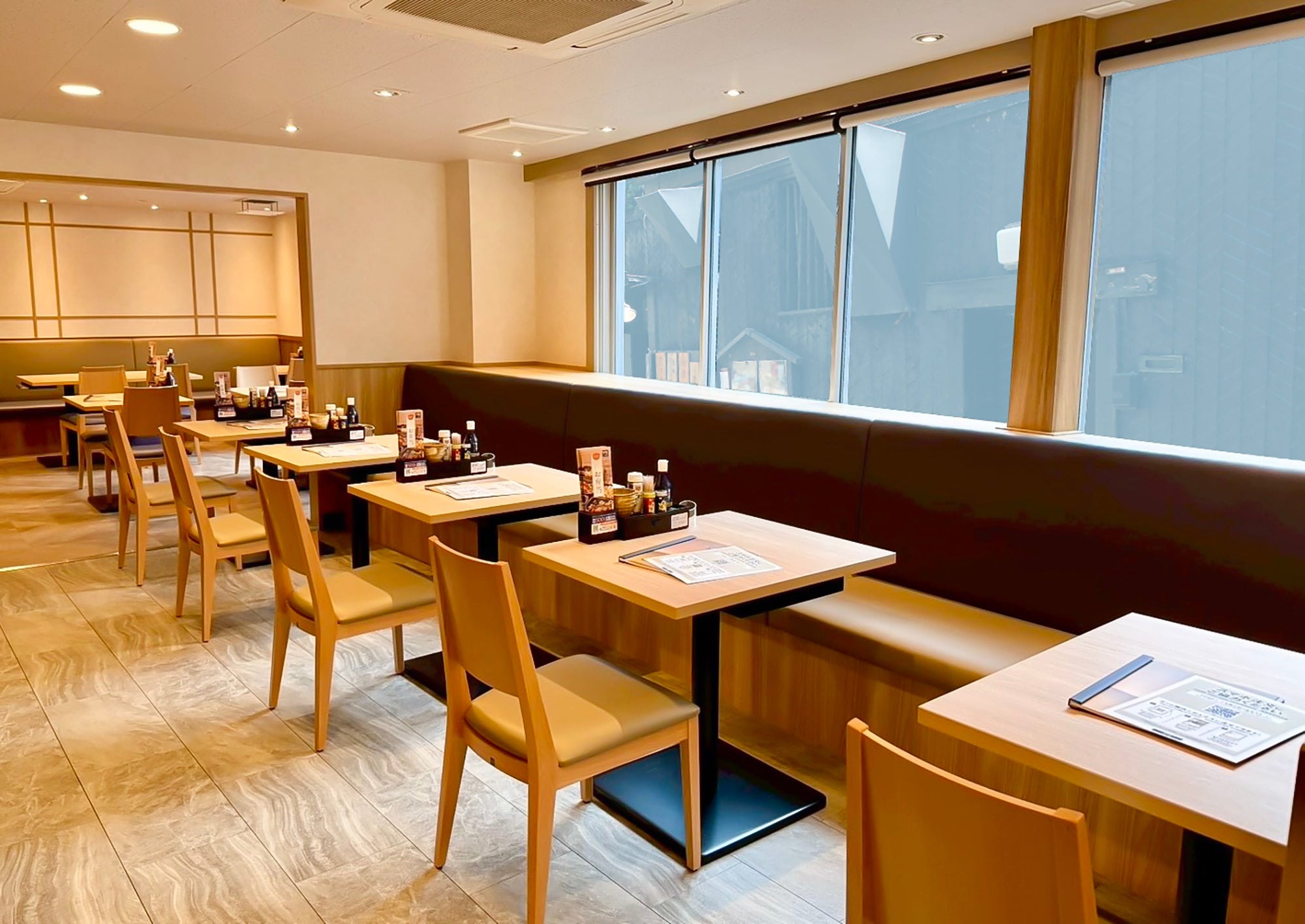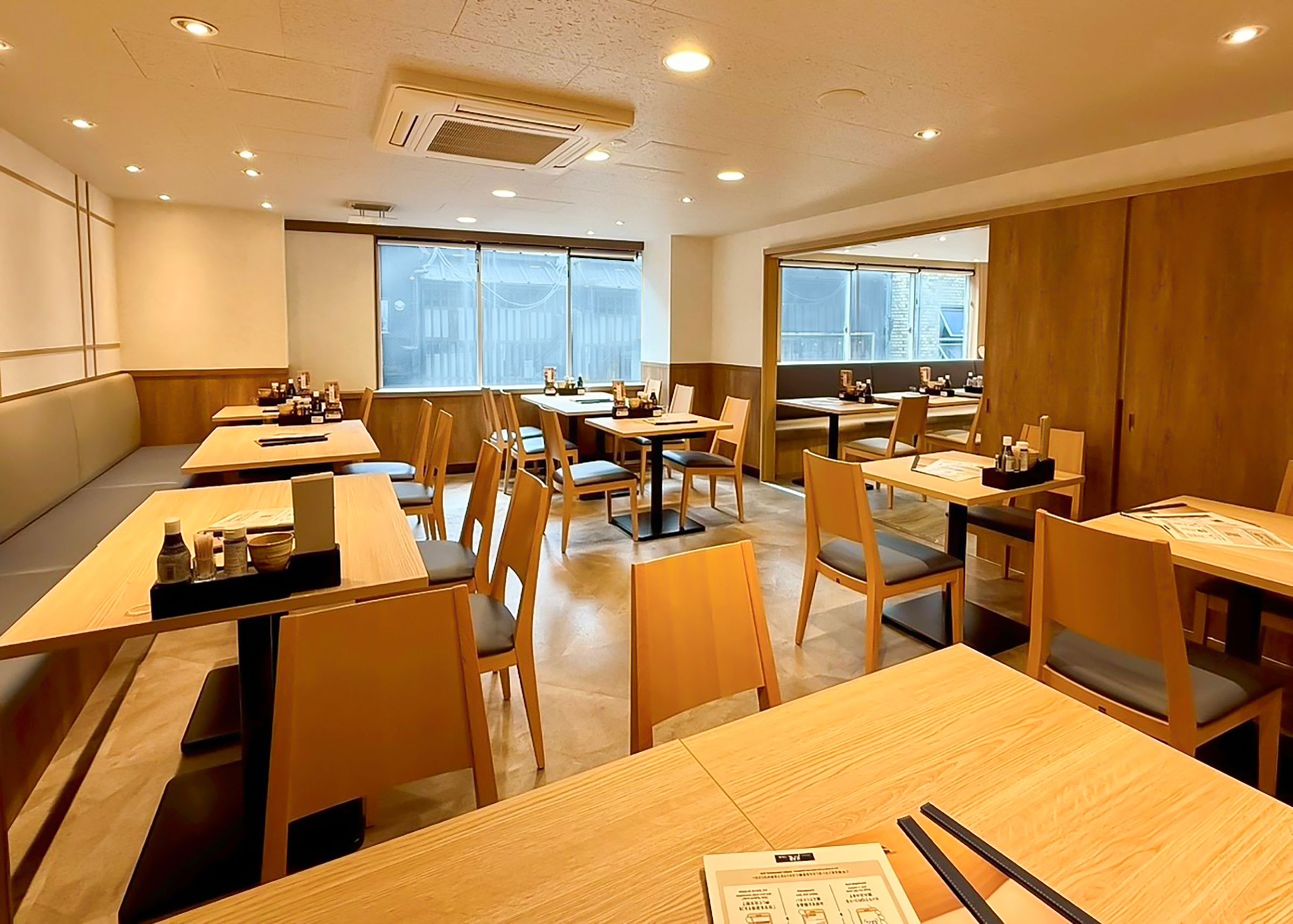 間が広がっています。木のぬくもりを感じる内装で、心地よい時間をお過ごしいただけます。全70席を備え、お一人様からご家族・ご友人とのお食事まで、さまざまなシーンでご利用いただけます。