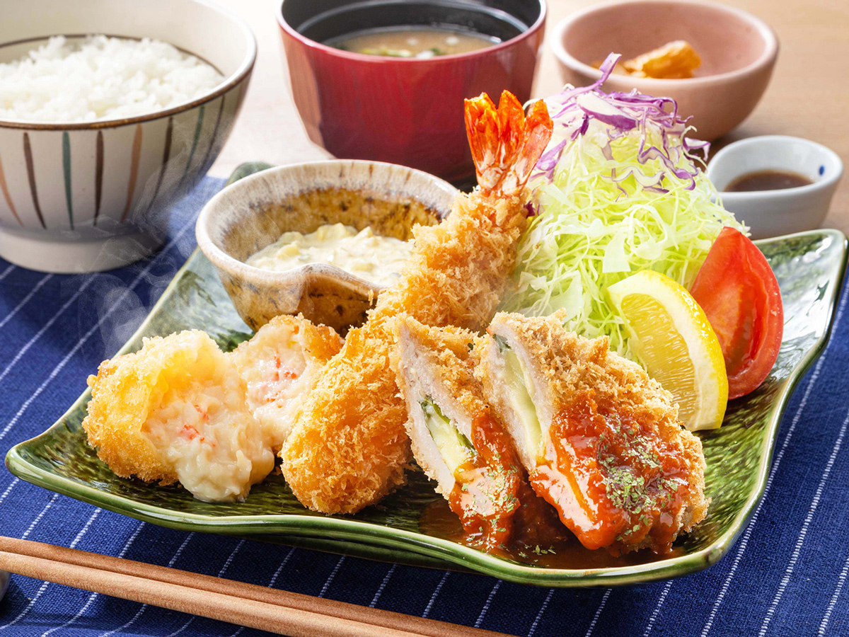 新年の"うまい"は贅沢なフライから。福を呼ぶ三種盛りで、心も気分もアガるひと口をお楽しみください。海老本来の旨みと食感が楽しめる「大海老フライ」に、かにの旨みたっぷりの「濃厚かにクリームコロッケ」、そしてデミソースで味わう「大葉とチーズの豚ヒレかつ」。こだわりの3種を一度に味わえる、贅沢感あふれるミックスフライ定食です 。