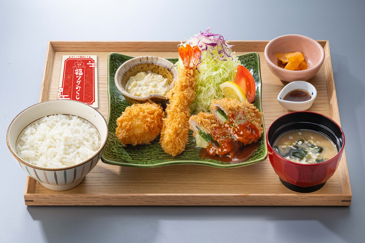1月8日の"大戸屋・定食の日"を記念して、「福アゲ三昧定食」を、同日より全国の大戸屋ごはん処(※フードコート店舗を除く)にて、3万食限定で販売いたします。大海老フライ、大葉とチーズの豚ヒレかつ、濃厚かにクリームコロッケを一度に味わえる贅沢な定食に、アプリ特典が必ず当たる「福アゲみくじ」をお付けし、新年にふさわしい楽しさと特別感をお届けいたします。また、1月8日(木)~1月13日(火)の6日間限定で、「福アゲ三昧定食」をお得にお楽しみいただける390円引きクーポンを配信いたします。
