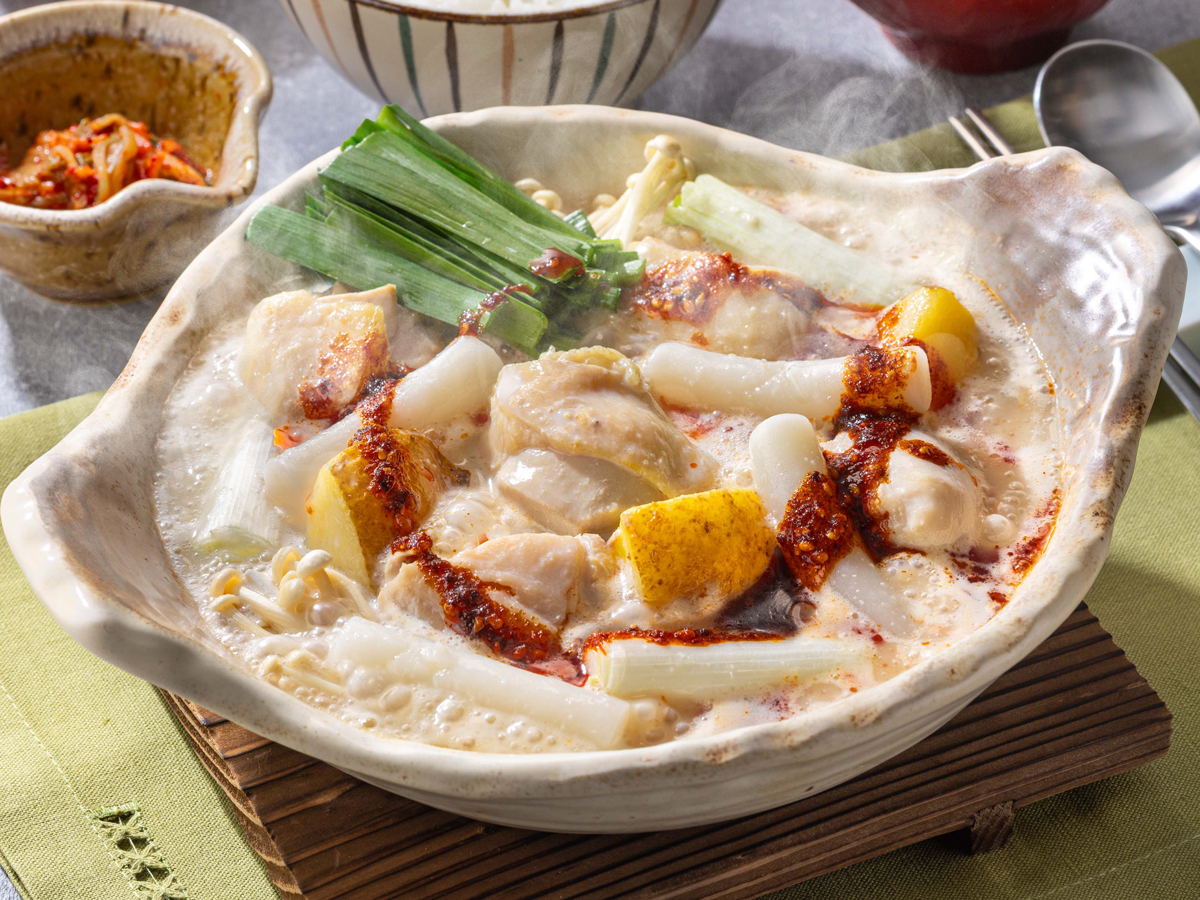 人気の韓国料理「タッカンマリ」を、大戸屋流にアレンジ。塩麴に漬け込んだ鶏肉に、じゃがいもや長ねぎ、トッポギ餅を合わせ、満足感のある一品に仕上げました。鶏出汁と豆乳のやさしいコクに、特製ラー油のほどよい辛味がアクセント。コク深いスープは、最後の一口までお楽しみいただけます。