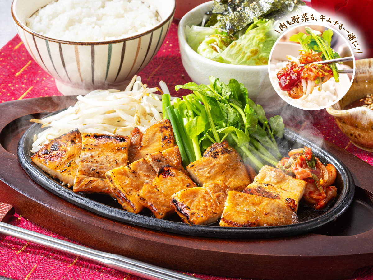 韓国みそダレに漬け込んだ豚バラ肉を、炭火で香ばしく焼き上げました。肉も野菜もキムチも一緒に!さらに、コクのあるコチュジャンベースの旨辛つけダレをお好みで。チョレギサラダ付きで、満足感のある一品です。