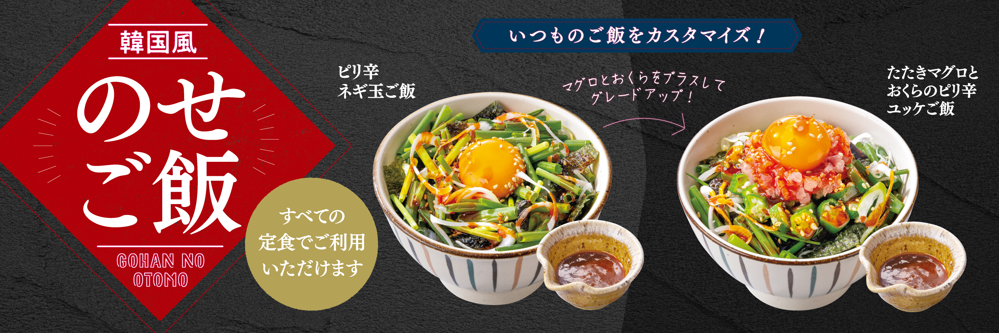 甘辛ソースととろり卵黄が絡む「ピリ辛ネギ玉ご飯」に、さらにマグロとおくらを加えた、満足感のある「ピリ辛ユッケご飯」をご用意しました。「韓国風のせご飯」は、すべての定食でご利用いただけます。この機会にぜひお試しください。